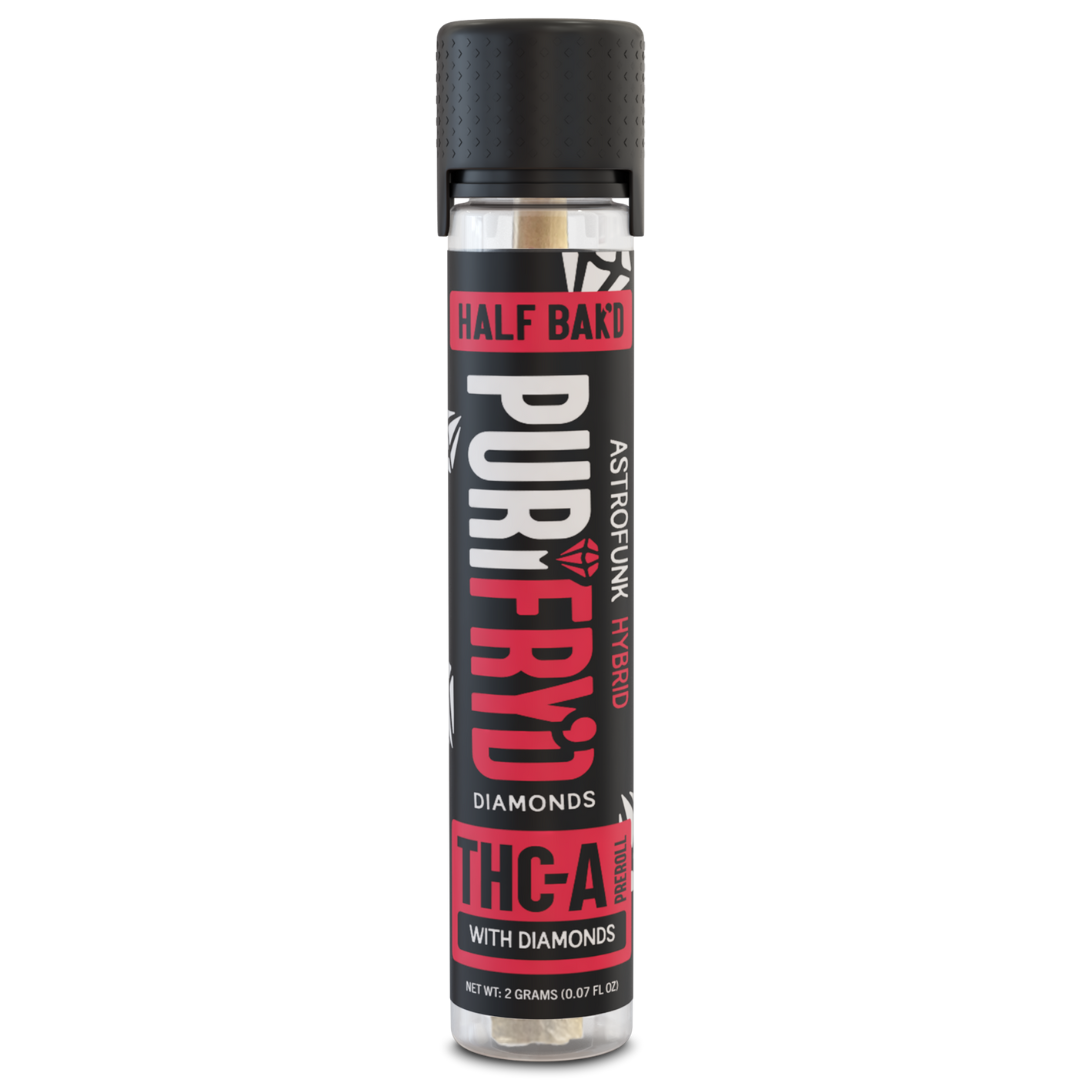 Half Bak’d Purifry’d Diamonds Pre-Rolls redefine luxury smoking with 2 grams of premium THCA flower infused with ultra-potent THC-A diamonds. Crafted for those who demand strength and flavor, each pre-roll delivers a powerful and flavorful experience from the first puff to the last.