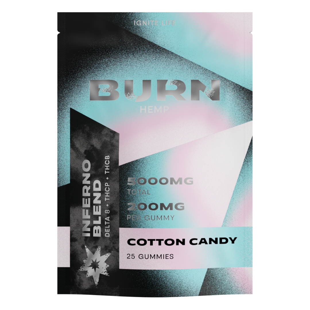 Turn up the heat with Burn Hemp Inferno Blend Gummies, infused with a fiery 200mg of cannabinoids per gummy—totaling 5000mg per jar. This high-potency formula blends Delta 8 THC, THCP, and THCB for a powerful, well-rounded hemp experience.