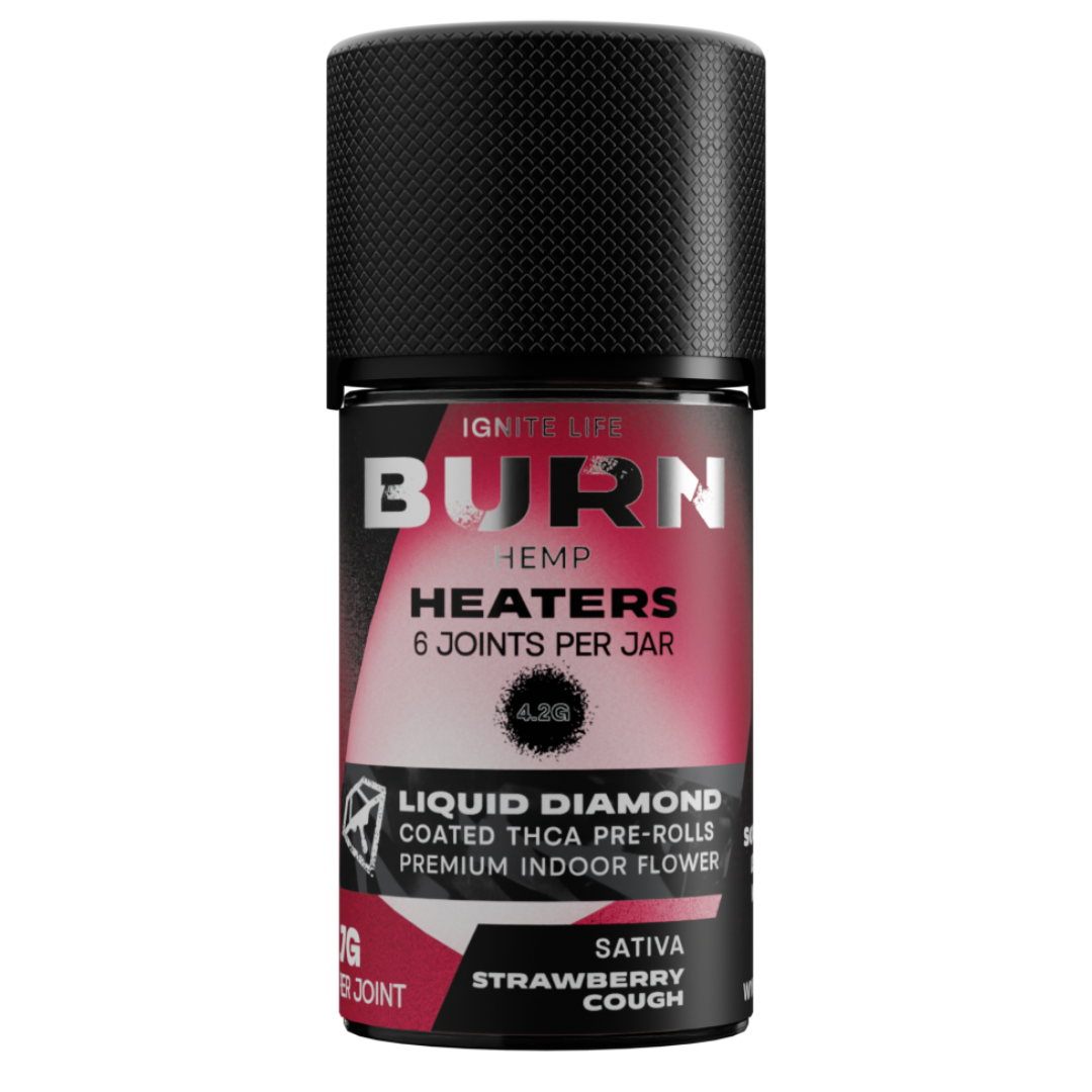 Burn Hemp Heaters set a new standard for premium pre-rolls, delivering exceptional potency and craftsmanship in every jar. Each container includes six high-quality joints, totaling 4.2 grams of potent indoor-grown flower, coated in liquid diamonds for an ultra-powerful smoking experience. Designed for connoisseurs, these pre-rolls provide both flavor and strength in one convenient package.